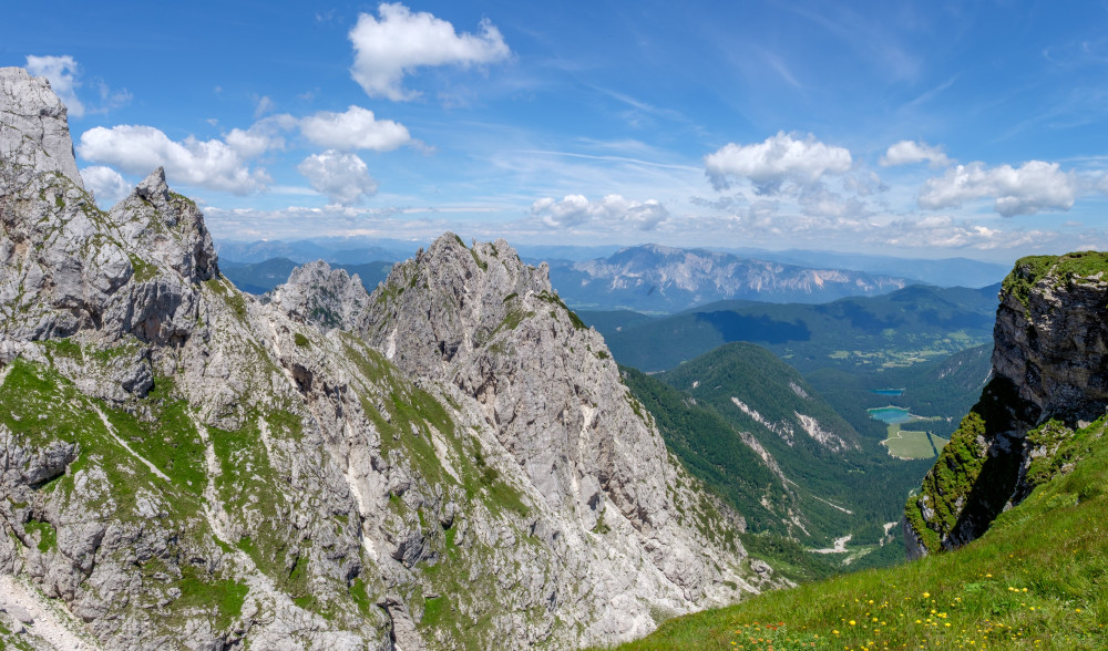 Narrow mountain pass with switchbacks, dramatic drops & sweeping summit views of the Julian Alps.