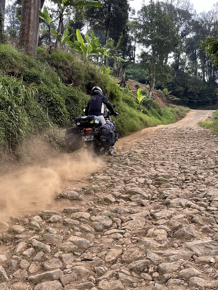 Initially rough ashphalt climbing from the south then rocky jeep track over the pass. Steep and challenging in a few places on a loaded adventure bike.